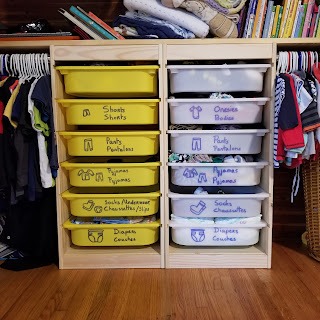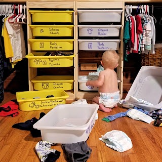 cleaning up: wiping up messes, putting toys back into their bin